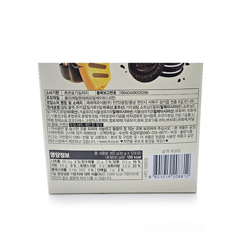 (1200)해태 자유시간 쿠앤크림 / (타) 30g X 12개 [1박스12타]